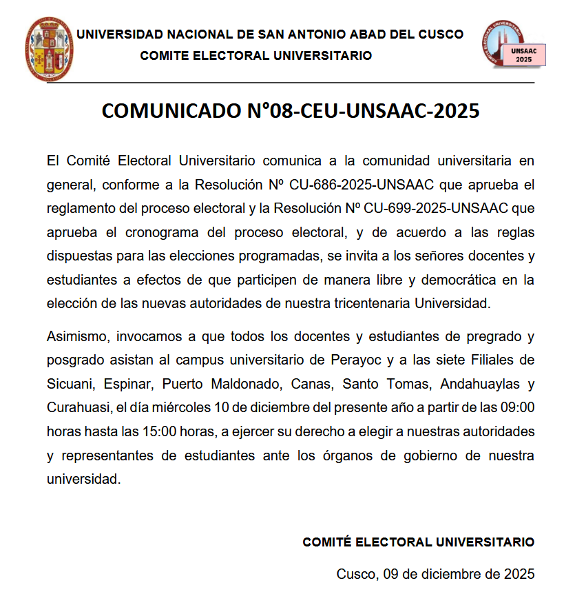• Resolución 09-2025-CEU-UNSAAC(DE 11 DE DICIEMBRE DE 2025 – PUBLICAR OFICIALMENTE LOS RESULTADOS)(11/12/2025): Descargar