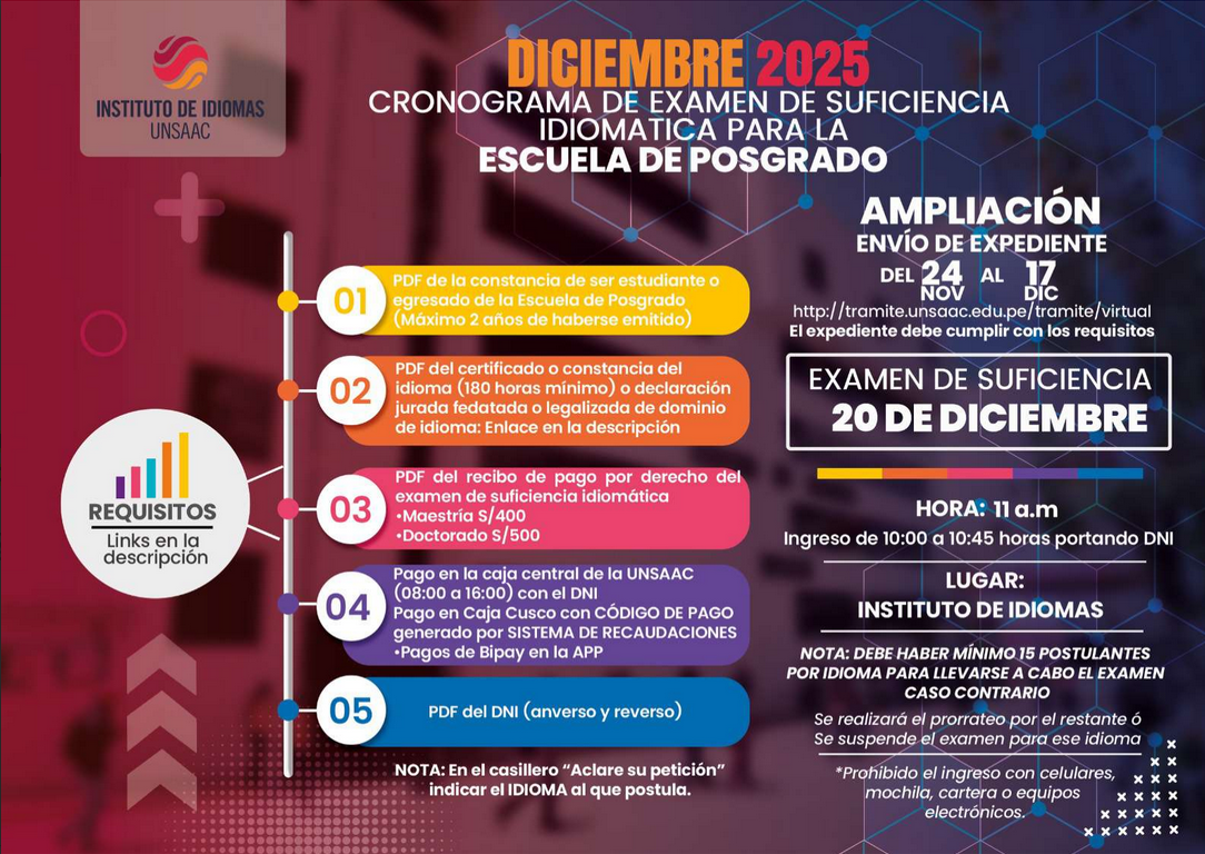• LUGAR : INSTITUTO DE IDIOMAS DE LA UNSAAC (El ingreso a la UNSAAC desde las 10:00 am hasta 10:45 am (unicamente) portando su DNI)