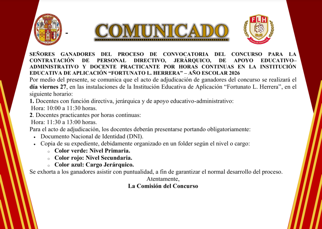 NOTA .- Los postulantes deberán de consignar de manera obligatoria en el Sistema PLADDES de la Unidad de Trámite Documentario, indicando como solicitud o petición: «CONCURSO PARA CONTRATA DE PERSONAL DE LA INSTITUCIÓN EDUCATIVA FORTUNATO L. HERRERA-2026». Asimismo, indique número de DNI, código y descripción de plaza a la que postula, nivel y turno. Caso contrario quedará invalidado su postulación del concurso en mención.